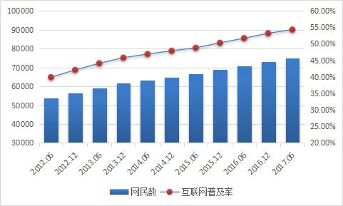 根據(jù)CNNIC最新數(shù)據(jù)顯示,截止2017年6月,我國網(wǎng)民規(guī)模達(dá)到7.51億,半年共計新增網(wǎng)民1992萬人?;ヂ?lián)網(wǎng)普及率為54.3%,較2016年底提升1.1個百分點。我國網(wǎng)民規(guī)模增長趨于穩(wěn)定,互聯(lián)網(wǎng)行業(yè)持續(xù)穩(wěn)健發(fā)展,以互聯(lián)網(wǎng)為代表的數(shù)字技術(shù)正在加速與經(jīng)濟(jì)社會各領(lǐng)域深度融合,成為促進(jìn)我國消費升級、經(jīng)濟(jì)社會轉(zhuǎn)型、構(gòu)建國家競爭新優(yōu)勢的重要推動力。