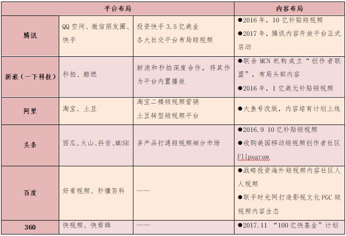 以BAT為首的機(jī)構(gòu)重金加速布局短視頻平臺。今日頭條、騰訊、秒拍等均投入10億元扶持短視頻內(nèi)容創(chuàng)業(yè)者。阿里投入20億元進(jìn)軍短視頻領(lǐng)域,將土豆網(wǎng)打造為專門的短視頻平臺。騰訊專門成立短視頻中心,負(fù)責(zé)短視頻平臺運行;愛奇藝短視頻平臺的愛奇藝頭條正在內(nèi)測;秒拍成為新浪微博獨家短視頻應(yīng)用,從工具型短視頻機(jī)構(gòu)轉(zhuǎn)型為社交分享類短視頻平臺;華人文化基金領(lǐng)投的資訊類短視頻平臺梨視頻也已形成業(yè)內(nèi)影響力;咪咕視訊作為中國移動在視頻領(lǐng)域的唯一版權(quán)運營實體,也布局短視頻,與中央電視臺共建業(yè)內(nèi)領(lǐng)先的短視頻創(chuàng)作者聚集平臺,打造頭部賬號體系,孵化自有明星短視頻賬號,引入知名工作室直接簽約,盤整已有的強(qiáng)IP資源賬號化運作。