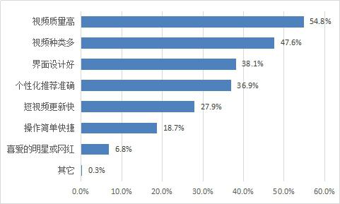 過半受訪者選擇短視頻APP時最看重的是短視頻質(zhì)量,占比達(dá)54.8%,視頻種類和數(shù)量(47.6%),界面設(shè)計(38.1%)、個性化推薦(36.9%)、更新速度(27.9%)也是用戶考量的重要因素。分析認(rèn)為,內(nèi)容是用戶最關(guān)心的要素,對于優(yōu)質(zhì)內(nèi)容的爭奪是各短視頻分發(fā)平臺今后競爭的重點。
