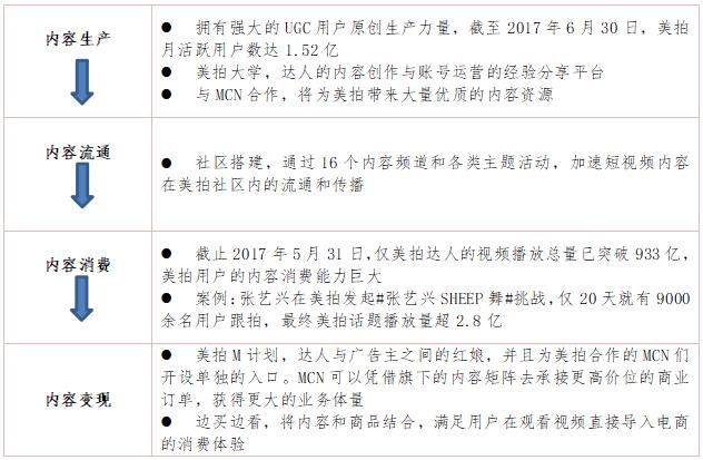美拍依托美圖公司的“泛女性化”產(chǎn)品布局,搭建完整的自有短視頻平臺生態(tài)閉環(huán),業(yè)務(wù)涉及內(nèi)容生產(chǎn)、內(nèi)容流通、內(nèi)容消費和內(nèi)容變現(xiàn)整個產(chǎn)業(yè)鏈條。