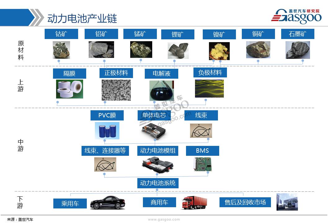 新能源動力電池產業(yè)鏈包含電芯/電池PACK、正負極材料、電解液、隔膜以及電池管理系統(tǒng)(BMS)。