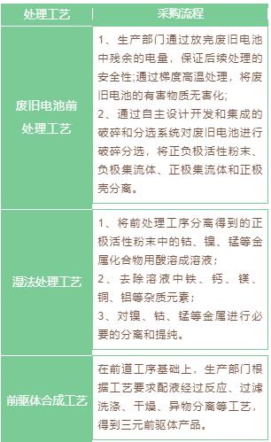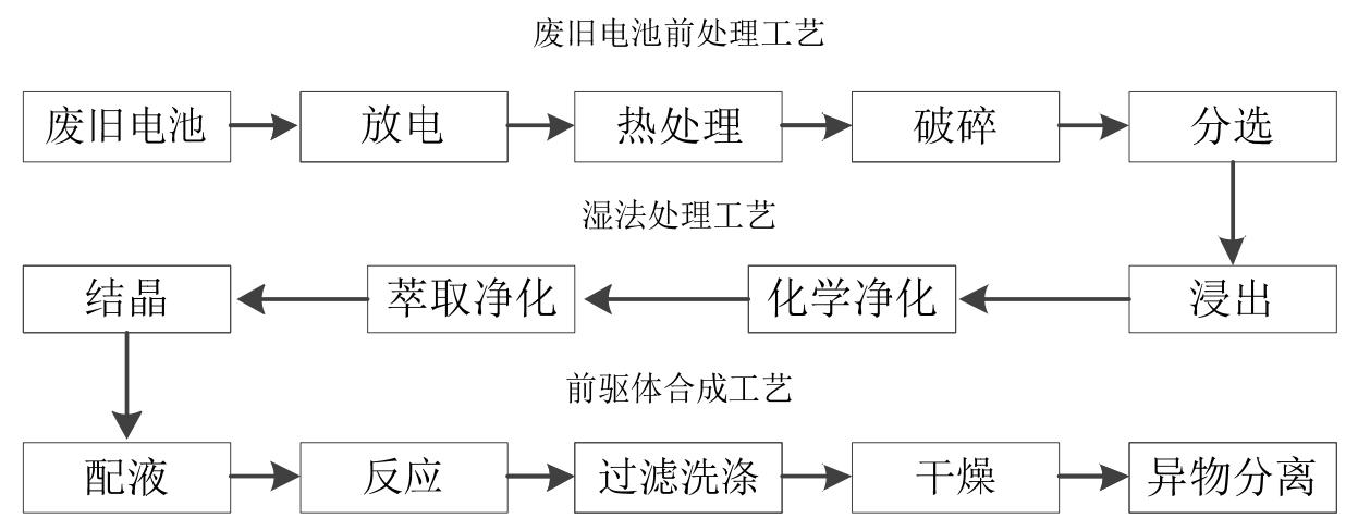 公司應用電池回收技術生產鋰電池材料,主要產品是三元前驅體,其生產流程分為廢舊電池前處理工藝、濕法處理工藝以及前驅體合成工藝三階段,具體過程為: