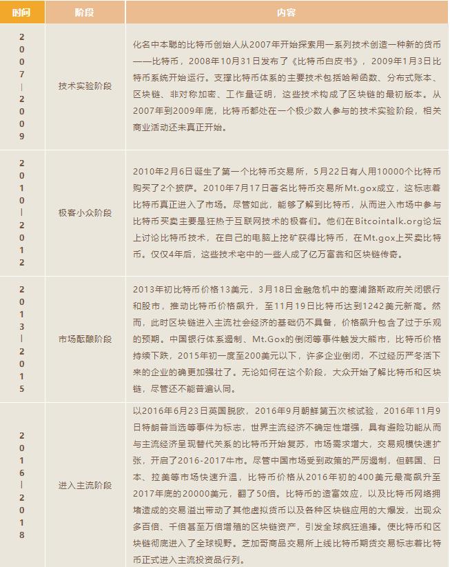 區(qū)塊鏈?zhǔn)怯梢幌盗屑夹g(shù)實(shí)現(xiàn)的全新去中心化經(jīng)濟(jì)組織模式,2009年誕生于比特幣系統(tǒng)的構(gòu)建,2017年成為全球經(jīng)濟(jì)熱點(diǎn),但區(qū)塊鏈的成功應(yīng)用寥寥,這個(gè)新興產(chǎn)業(yè)還遠(yuǎn)未成熟。其發(fā)展大體可劃分為六個(gè)階段。