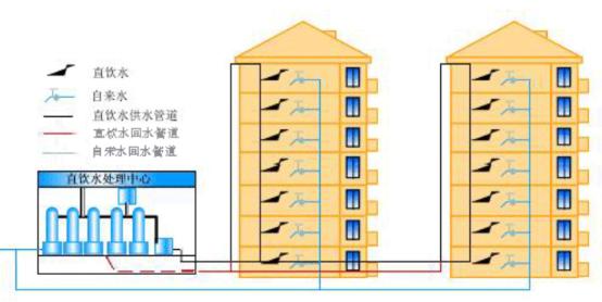 管道直飲水也稱分質(zhì)供水,興建于20世紀(jì)90年代中期,主要分布在人口較為集中的學(xué)校、醫(yī)院、商務(wù)樓宇、較高檔的小區(qū)。分質(zhì)供水是以自來(lái)水為原水,把自來(lái)水中生活用水和直接飲水區(qū)分開,另設(shè)管道直通住戶,實(shí)現(xiàn)飲用水和生活用水分質(zhì)、分流,達(dá)到直飲的目的。管道直飲水通過(guò)中央凈水設(shè)備在自來(lái)水提供的原水基礎(chǔ)上經(jīng)過(guò)再凈化過(guò)程提供給人們飲用,通過(guò)一些物理過(guò)濾、消毒殺菌等深度處理技術(shù)對(duì)自來(lái)水進(jìn)行進(jìn)一步處理,去除水中的有機(jī)物、重金屬、細(xì)菌、病毒等有害物質(zhì),滿足優(yōu)質(zhì)優(yōu)用、低質(zhì)低用的要求。