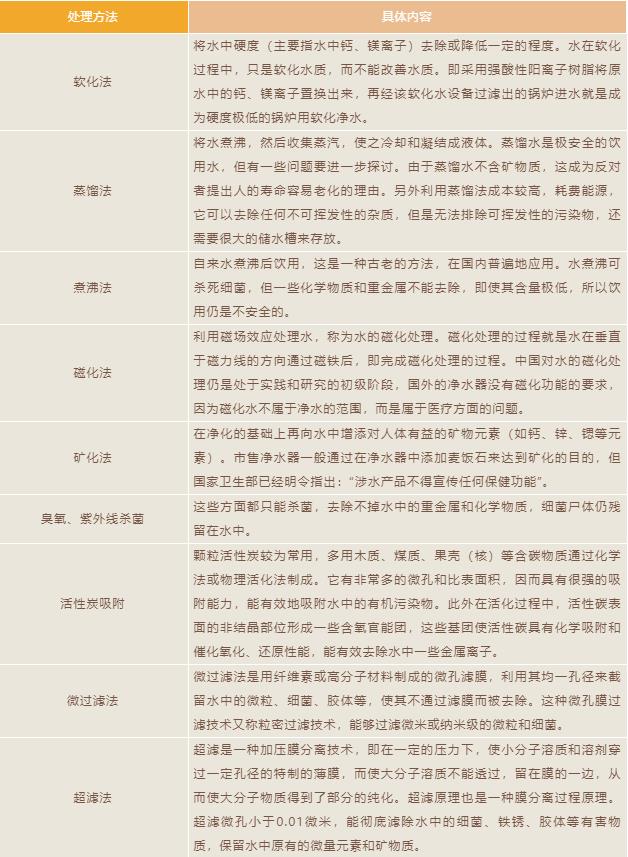 水質(zhì)處理方式有以下十類:軟化法、蒸餾法、煮沸法、磁化法、礦化法、臭氧紫外線殺菌、活性炭吸附、RO逆滲透膜、微過(guò)濾、超過(guò)濾。