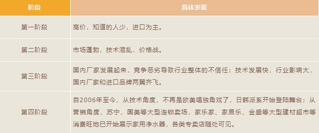 從中國(guó)家用凈水器的發(fā)展過(guò)程及技術(shù)趨勢(shì)來(lái)看,凈水器在國(guó)內(nèi)的發(fā)展大致可以分為以下四個(gè)階段: