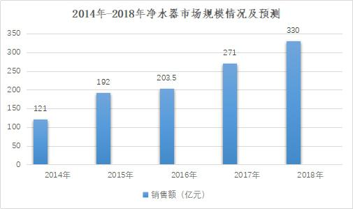 我國(guó)凈水器市場(chǎng)尚未完全開發(fā),目前我國(guó)凈水器市場(chǎng)覆蓋率僅5%,而韓國(guó)的市場(chǎng)覆蓋率高達(dá)95%。這其中,蘊(yùn)含著巨大的商機(jī),未來(lái)凈水器市場(chǎng)可以發(fā)展成上千億乃至更多的產(chǎn)業(yè)。根據(jù)中商產(chǎn)業(yè)研究院發(fā)布的《2018-2023年中國(guó)凈水器市場(chǎng)前景及投資機(jī)會(huì)研究報(bào)告》數(shù)據(jù)顯示,2016年中國(guó)凈水器銷售規(guī)模為203.5億元,同比增長(zhǎng)40.6%;2017年中國(guó)凈水器市場(chǎng)規(guī)模達(dá)271億元,同比增長(zhǎng)33.2%,其中線上可達(dá)213億元,線下可達(dá)58億元。同時(shí),在2018年中國(guó)凈水器銷售規(guī)模或?qū)⑼黄?30億元。