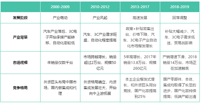 中國汽車產(chǎn)業(yè)制造水平相對落后,3C電子開始承接第三次全球產(chǎn)能轉(zhuǎn)移(日韓臺到中國),自動化程度較低。外資機器人巨頭普遍2000年前后進入中國,工業(yè)機器人年銷售數(shù)千臺,基本都是外資品牌,主要用于汽車行業(yè)。國內(nèi)企業(yè)以做外資的系統(tǒng)集成和代理商為主,極少數(shù)企業(yè)如沈陽新松有自研機器人本體。