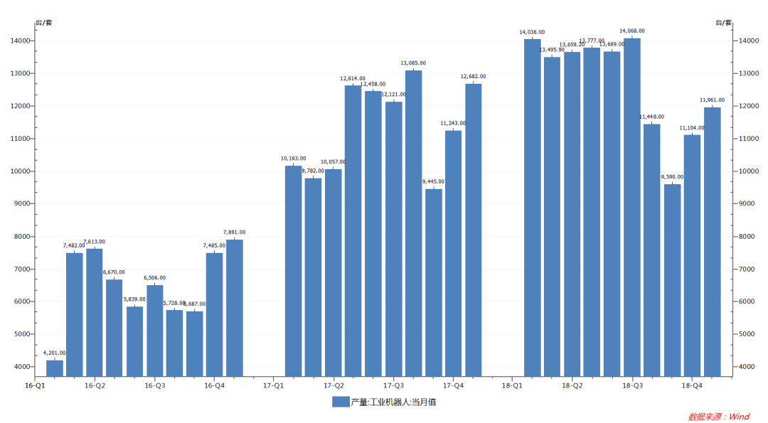 2018年1-12月,我國工業(yè)機器人產(chǎn)量達14.7萬臺,同比增長12.2%;其中12月份產(chǎn)量達11961臺。受國內(nèi)宏觀經(jīng)濟下行,下游汽車、3C、新能源等行業(yè)投資放緩和中美貿(mào)易戰(zhàn)的影響,國內(nèi)工業(yè)機器人行業(yè)發(fā)展壓力逐步顯現(xiàn),6月、7月、8月增幅相比前幾個月35%的增速大幅下降。但工業(yè)機器人行業(yè)短期的增速放緩并不能改變機器代人的大趨勢。我國自動化改造空間巨大,制造業(yè)轉(zhuǎn)型升級迫切;人口紅利逐步消失,老齡化問題嚴重,勞動力出現(xiàn)短缺;疊加國家政策的大力支持,我國工業(yè)機器人行業(yè)未來發(fā)展空間仍然巨大。