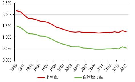 另一方面,中國近年來的人口出生率和自然增長率也呈現(xiàn)不斷下降的趨勢,2017年比2016年出生人口減少了63萬人,人口出生率僅為12.4‰,同比降低0.5‰,這一數(shù)據(jù)比日本的出生率還要低。我國的人口自然增長率更是下降到5.3‰,長期的低生育水平直接加大了對未來我國勞動力不足的擔憂。