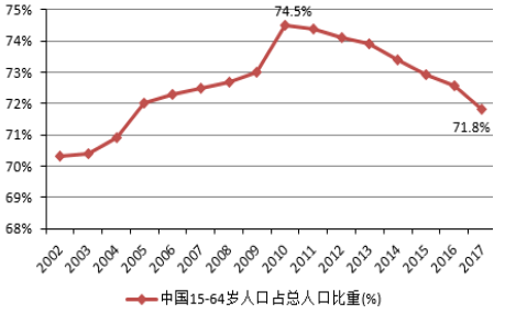 近年來,中國人口結構發(fā)生了巨大變化,15-64歲勞動適齡人口占總人口的比重自2011年以來呈現(xiàn)逐步下滑的趨勢,2017年該比重已經(jīng)下滑至71.8%,相比2010年的最高點降低了2.7個百分點。另外,中國社會的老齡化問題更加嚴重,中國人口紅利逐步消失,目前已經(jīng)出現(xiàn)了劉易斯拐點。人口結構的變化,勞動力供給條件的變化顯著的推高了我國的勞動成本,不僅削弱了制造業(yè)的競爭力,對勞動密集型的產(chǎn)業(yè)同樣也帶來了嚴峻的挑戰(zhàn),也削弱了中國產(chǎn)品在全球市場的競爭力。