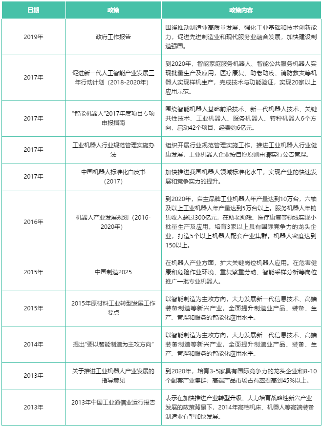 智能制造是“中國制造2025”發(fā)展規(guī)劃的重要發(fā)展方向,是未來制造業(yè)發(fā)展的必然趨勢,工業(yè)機器人是智能制造的關鍵設備,行業(yè)發(fā)展?jié)摿薮蟆=陙?,國家出臺了一系列的政策支持和鼓勵中國工業(yè)機器人行業(yè)的發(fā)展。根據(jù)2016年國務院發(fā)布的《機器人產(chǎn)業(yè)發(fā)展規(guī)劃(2016-2020年)》,到2020年,我國工業(yè)機器人產(chǎn)量達到10萬臺,六軸及以上工業(yè)機器人年產(chǎn)量達到5萬臺以上;培育3家以上具有國際競爭力的龍頭企業(yè);機器人密度達到150以上。