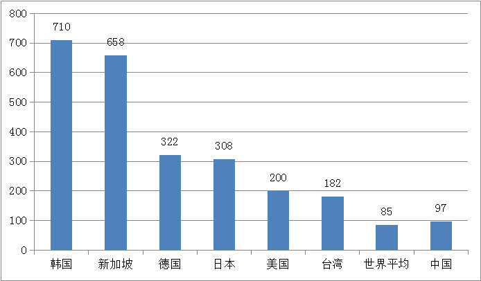 2017年全球主要市場工業(yè)機器人密度對比(臺/萬人)