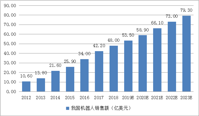 2018年,我國工業(yè)機器人銷售額達48億美元,同比增長24.1%。未來隨著生產(chǎn)方式向柔性、智能、精細轉(zhuǎn)變,對工業(yè)機器人的需求將呈現(xiàn)大幅增長。根據(jù)前瞻產(chǎn)業(yè)研究院的預測,到2023年,國內(nèi)市場規(guī)模將翻一番,進一步擴大到79.3億美元。