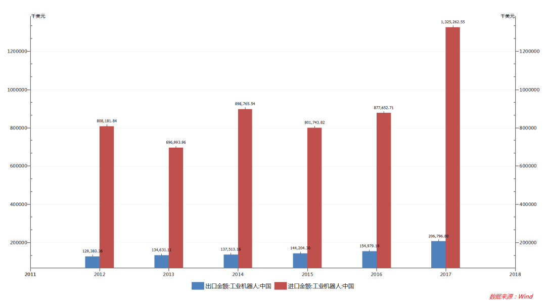 中國工業(yè)機器人進出口金額(萬美元)