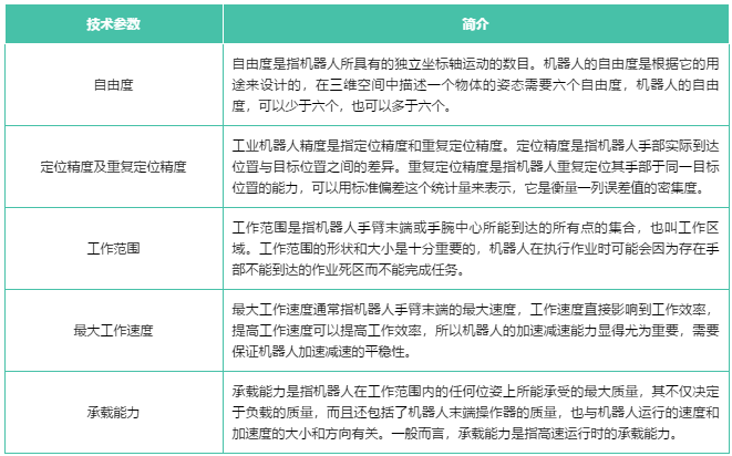 工業(yè)機器人的主要技術參數(shù)一般有自由度、定位精度及重復定位精度、工作范圍、最大工作速度和承載能力等。這些參數(shù)是工業(yè)機器人本體制造過程中重要的考量指標,是衡量一家廠商本體制造水平高低的標準。