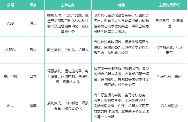 在世界工業(yè)機器人行業(yè)中,以瑞士的ABB、德國的庫卡、日本的發(fā)那科和安川電機最為著名,并稱為工業(yè)機器人“四大家族”。它們在亞洲市場上同樣有著舉足輕重的地位,在中國工業(yè)機器人市場上占據(jù)大半江山,幾乎壟斷了機器人本體制造、焊接等高端領域。