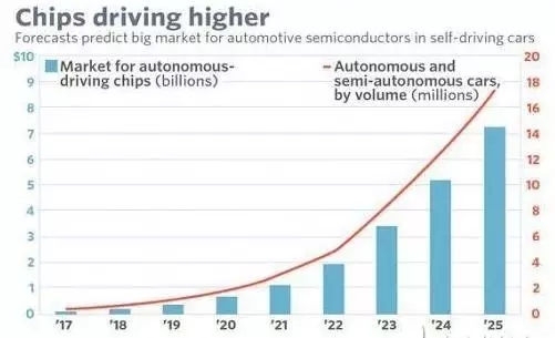 以無人駕駛汽車的智能化趨勢為例,摩根大通估計到2025年,用于無人駕駛汽車的半導(dǎo)體器件銷售額可達(dá)73億美元,從2017年到2025年的年復(fù)合增長率高達(dá)62.5%。2015年全球汽車半導(dǎo)體總銷售額不過300億美元,摩根估計平均每部車用到的芯片價值將從現(xiàn)在的300至400美元增長到2025年400至500美元。