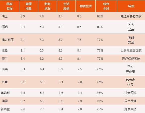 法盛全球資產(chǎn)管理公司(Natixis Global Asset Management),根據(jù)世界銀行、世界衛(wèi)生組織等提供的數(shù)據(jù),從醫(yī)療環(huán)境、預期壽命、金融穩(wěn)定和生活質量等20個方面,綜合比較了全球150個國家的養(yǎng)老情況,評出了前十名: