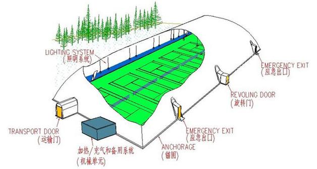 氣膜建筑也稱為“空氣支撐結(jié)構(gòu)”—air supported structure,是以特殊的建筑膜材為建筑外殼,并配備一套智能化的運(yùn)行控制系統(tǒng)為完全密閉的氣膜建筑內(nèi)部提供空氣壓力,使整體建筑內(nèi)部始終保持對(duì)外部環(huán)境的正壓,從而靠?jī)?nèi)、外部壓力差把建筑主體支撐起來(lái)的一種建筑結(jié)構(gòu)系統(tǒng)。一套完整的氣膜建筑系統(tǒng)還包括了照明系統(tǒng)和門(mén)禁系統(tǒng)。