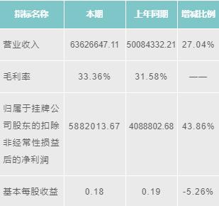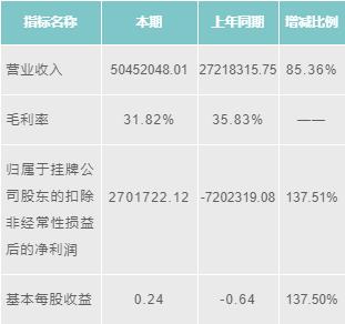 維拓環(huán)境2016年?duì)I業(yè)收入為50452048.01元,增長(zhǎng)85.36%;毛利潤(rùn)為31.82%;歸屬于掛牌公司股東的扣除非經(jīng)常性損益后的凈利潤(rùn)為2701722.12元,增長(zhǎng)137.51%;基本每股收益為0.24元,增長(zhǎng)137.50%。