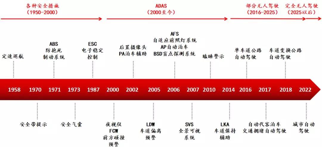 無人駕駛技術最初的發(fā)展從減少、防止機動車事故開始。從1950年至2000年,OEM車廠和Tier 1的零部件制造商對車輛發(fā)明、生產了許多結構性的改進。最核心的就是四大安全系統(tǒng):安全帶,防抱死制動系統(tǒng)(ABS),安全氣囊和電子穩(wěn)定控制(ESC)。