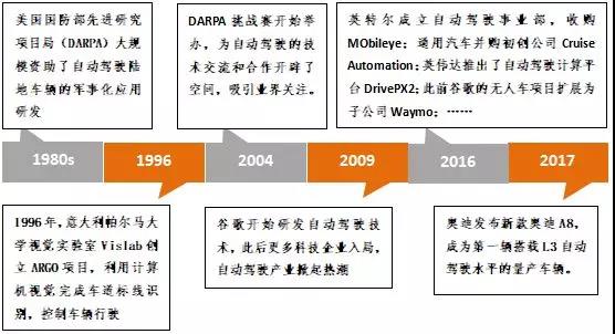 無人駕駛的概念早已有之。早在1925年,無線電設備公司Houdina Radio Control公司設計實現(xiàn)第一輛無人駕駛汽車American Wonder;1956年,通用公司公布世界上第一輛配備了汽車安全及自動導航系統(tǒng)的概念車Firebird II;20世紀 60、70年代,西方發(fā)達國家開展無人駕駛車輛研究應用于軍亊領域;20世紀90年代開始,技術的突破帶動無人駕駛汽車的快速發(fā)展,激發(fā)了各國研究的熱情;2004年,美國國防部高級研究項目局(DARPA)舉辦了無人駕駛進程中最重要的挑戰(zhàn)賽,三屆比賽對后來的技術發(fā)展產生了深進的影響;2009年開始,Google為代表的各大公司陸續(xù)開始無人駕駛技術的研究,拉開了產業(yè)序幕。隨著技術產業(yè)鏈的日臻成熟,2016年被公認是無人駕駛元年,目前業(yè)界也正在積極推動以市場為主導、企業(yè)為主體的產業(yè)化落地。