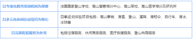 在法國(guó),登山向?qū)?duì)顧客的行為承擔(dān)法律責(zé)任,這些以技術(shù)高超、經(jīng)驗(yàn)豐富,責(zé)任感強(qiáng)而著稱的向?qū)冊(cè)谌澜缍枷碛惺⒆u(yù)。國(guó)立登山滑雪學(xué)校開(kāi)設(shè)的項(xiàng)目有登山向?qū)?、滑雪教練、高山協(xié)作、救援、滑翔傘教練。學(xué)校設(shè)備齊全,配有六個(gè)可容納20至80人的會(huì)議室、一個(gè)可容納220人且配有錄像投影機(jī)的階梯教室、一棟配有132個(gè)標(biāo)間的宿舍樓、一個(gè)自助餐中心、一個(gè)健身房、一個(gè)器材室及其它科研場(chǎng)所。因?yàn)?/b>ENSA的存在,沙木尼成為全球登山標(biāo)準(zhǔn)的定制者,完善的培訓(xùn)和卓越的服務(wù)成為其登山產(chǎn)業(yè)發(fā)展的護(hù)城河。